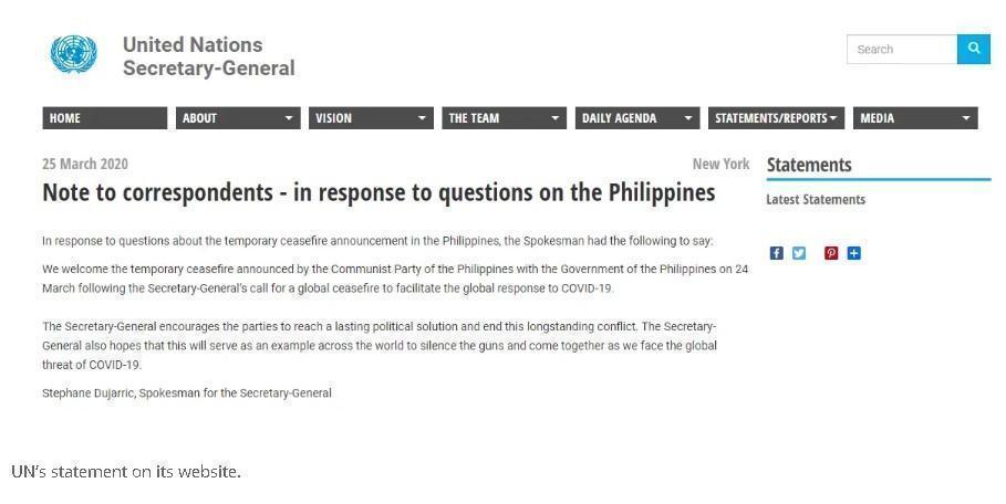 In a statement, Stephane Dujarric, spokesperson for UN Secretary General Antonio Guterres, said they welcome the truce order issued by the CPP last Tuesday, March 24, against Government of the Republic of the Philippines (GRP) armed forces.