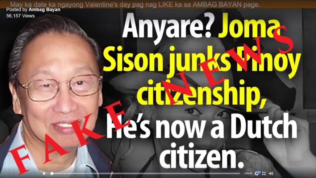 As evidenced by this film clip attached hereto, presidential spokesman Roque, PTV and the Duterte troll group Ambag Bayan are engaged in spreading the fake news that I have become a Dutch citizen. This is similar to the previous fake news that I have been recently arrested by Dutch authorities as a consequence of Duterte´s Proclamation 374 against ¨ẗerrorism¨.