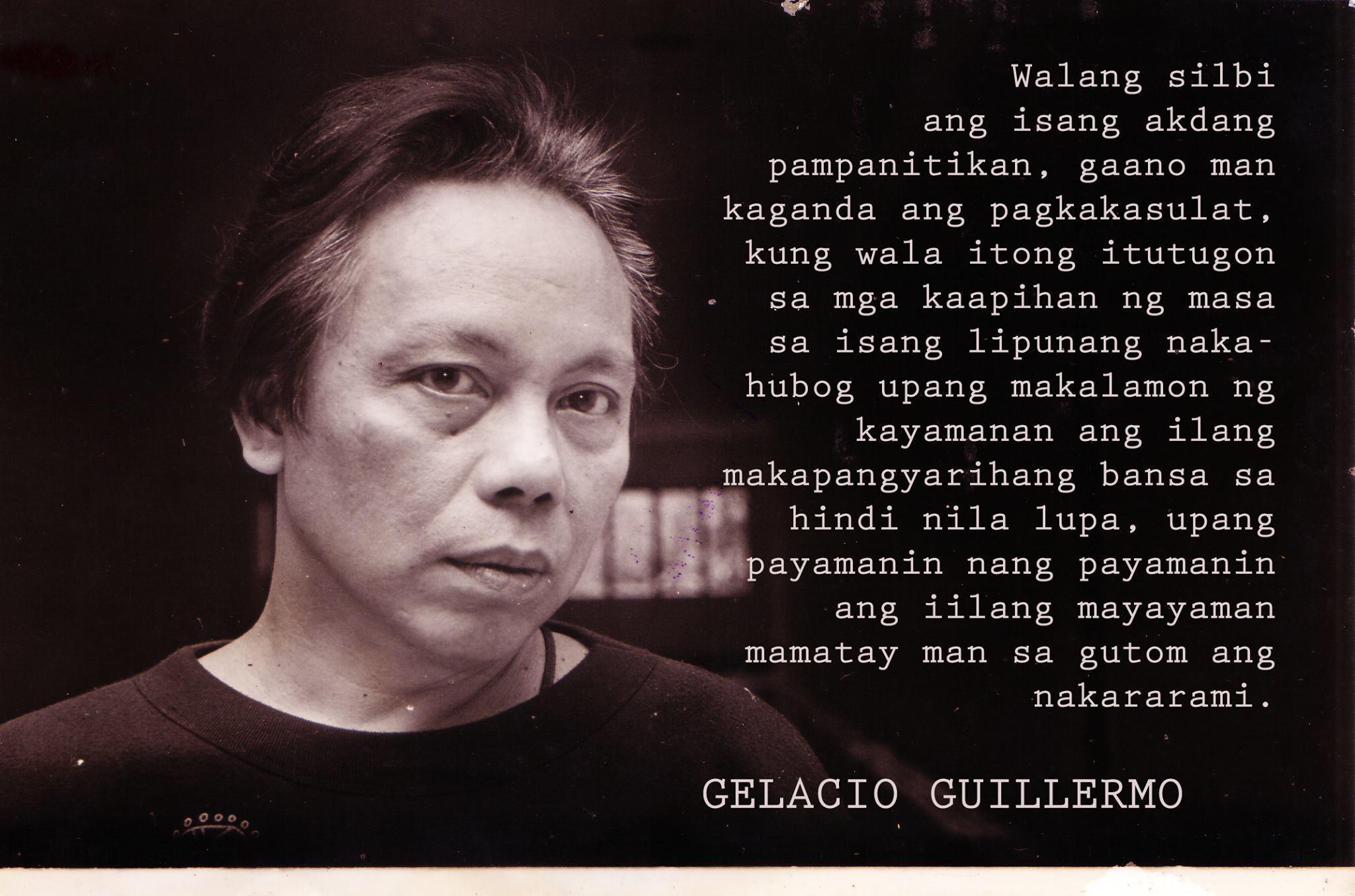 We are deeply saddened by the demise of Ka Gelacio Guillermo, poet of the people and proletarian revolutionary. We express condolences to his children, Bomen and Sophie, and grandchildren. We take the occasion to recall our close comradeship with him, honor his memory and celebrate his achievements in order to help perpetuate his legacy and continue his revolutionary inspiration to the Filipino youth and entire people.