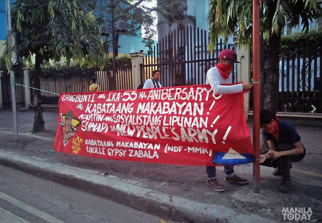 Members of Leftist underground youth organization, Kabataang Makabayan Lucille Gypsy Zabala Brigade, under the National Democratic Front Metro Manila, staged a lightning rally at the University Belt in Manila early morning on November 29.