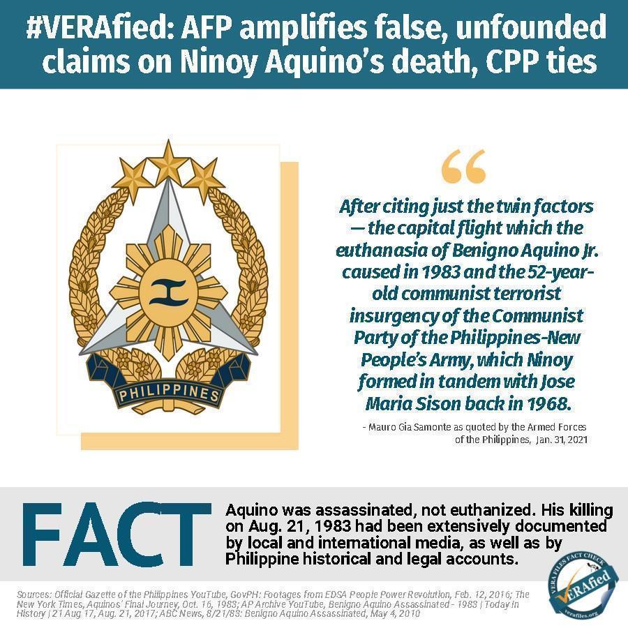 The Armed Forces of the Philippines (AFP) shared on Facebook (FB) a column published in The Manila Times that bore inaccurate claims about the late senator Benigno “Ninoy” Aquino Jr.’s death and supposed ties to the Communist Party of the Philippines (CPP).