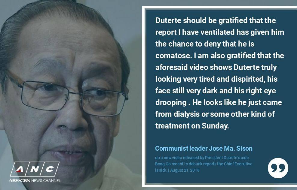 Here is Communist Party of the Philippines founder Joma Sison’s response to the President’s live Facebook video meant to debunk reports that he is sick.