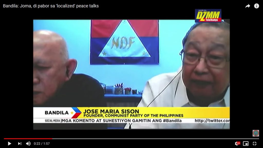 Muling bumanat si Communist Party of the Philippines founding chairman Joma Sison. Mariin din niyang tinanggihan ang kagustuhan ng gobyerno na magkaroon ng “localized” peace talks.