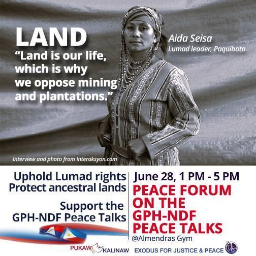 Support the indigenous people’s agenda as we look forward for the resumption of the GPH-NDF Peace Talks in July! Join the Forum on GPH-NDF Peace Talks this June 28, 1- 5 PM at Almendras Gym.