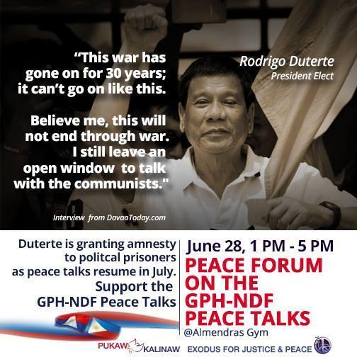 Unite for Just and Lasting Peace. Support the Peace Talks. Join our Pukaw Kalinaw Forum on the GPH-NDF Peace Talks on June 28, 1-5PM at Almendras Gym.